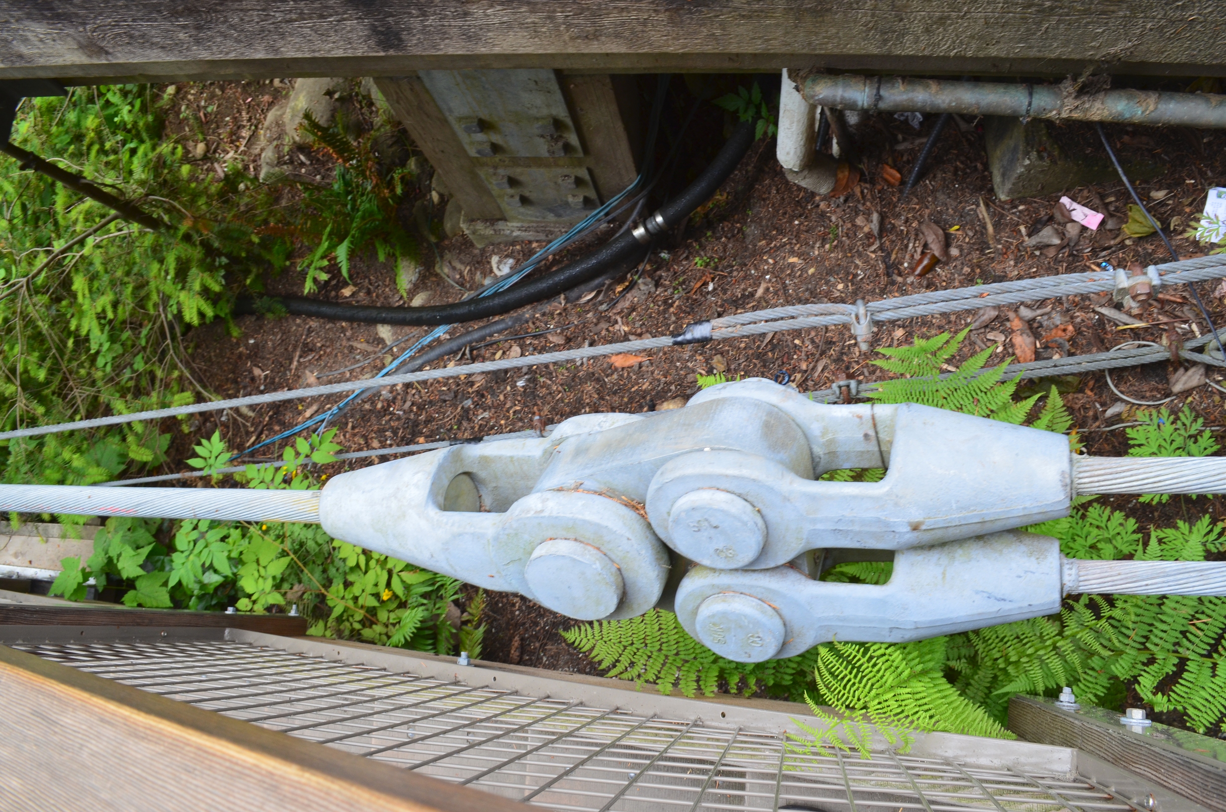 The support cables are substantial, and have proven themselves to be up to the task. In November of 2006 a very large Douglas fir fell on the bridge. The tree snapped in half on impact, leaving a 17 ton log across the bridge. The 13 ton anchors absorbed the shock load by shifting, as designed.