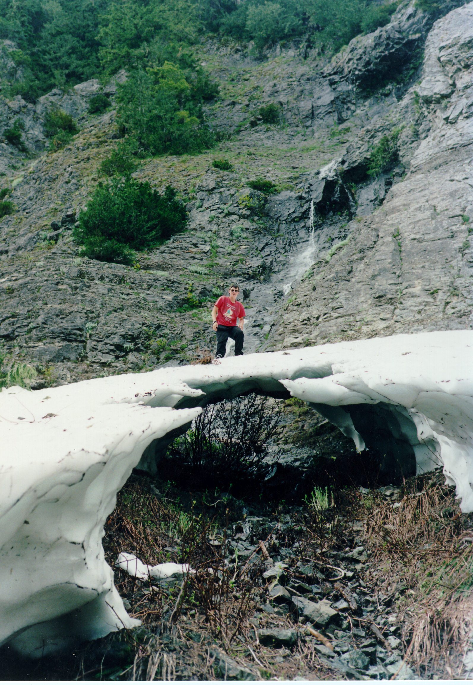 Here is another of the authors early encounters with a scary bridge. This snow bridge was located on the Wonderland Trail where it descends from Ipsut pass into Carbon Canyon. It was created as a creek carved a tunnel through a snow bank. As the snow bank melted and the tunnel grew a natural arch formed - located right where the Wonderland trail crosses an upper fork of Ipsut creek. Thus forming a bridge which provides a very unsafe way to cross the creek without getting your feet wet.