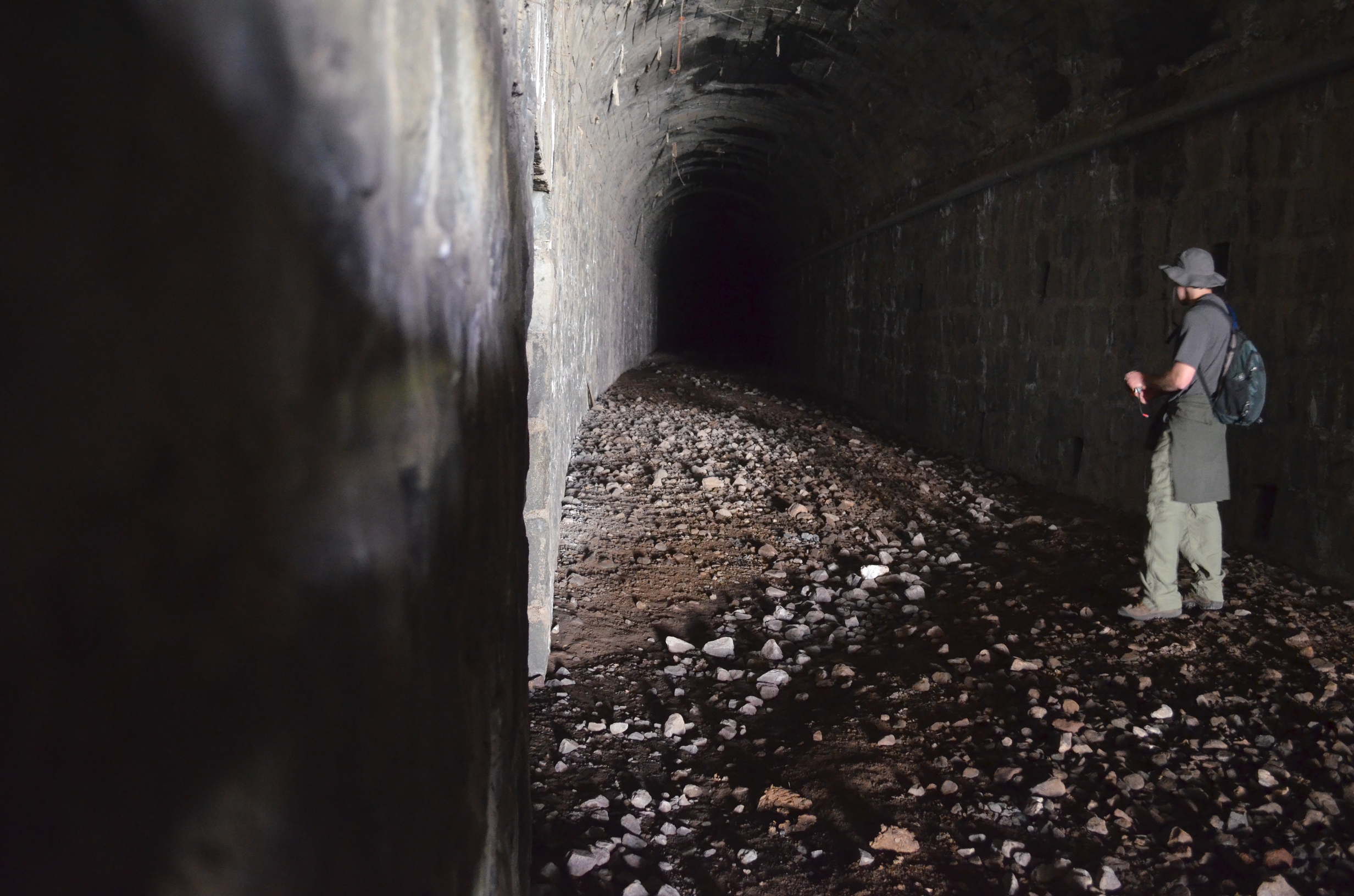 Some of the snow sheds came in the form of a stone and concrete tunnel built over the track. Over time the rocks and debris buried the snowshed, turning it into a true tunnel. In this photo the stream completely buried one side of the snowshed and partly filled the rest with rocks. The snowshed is found here.