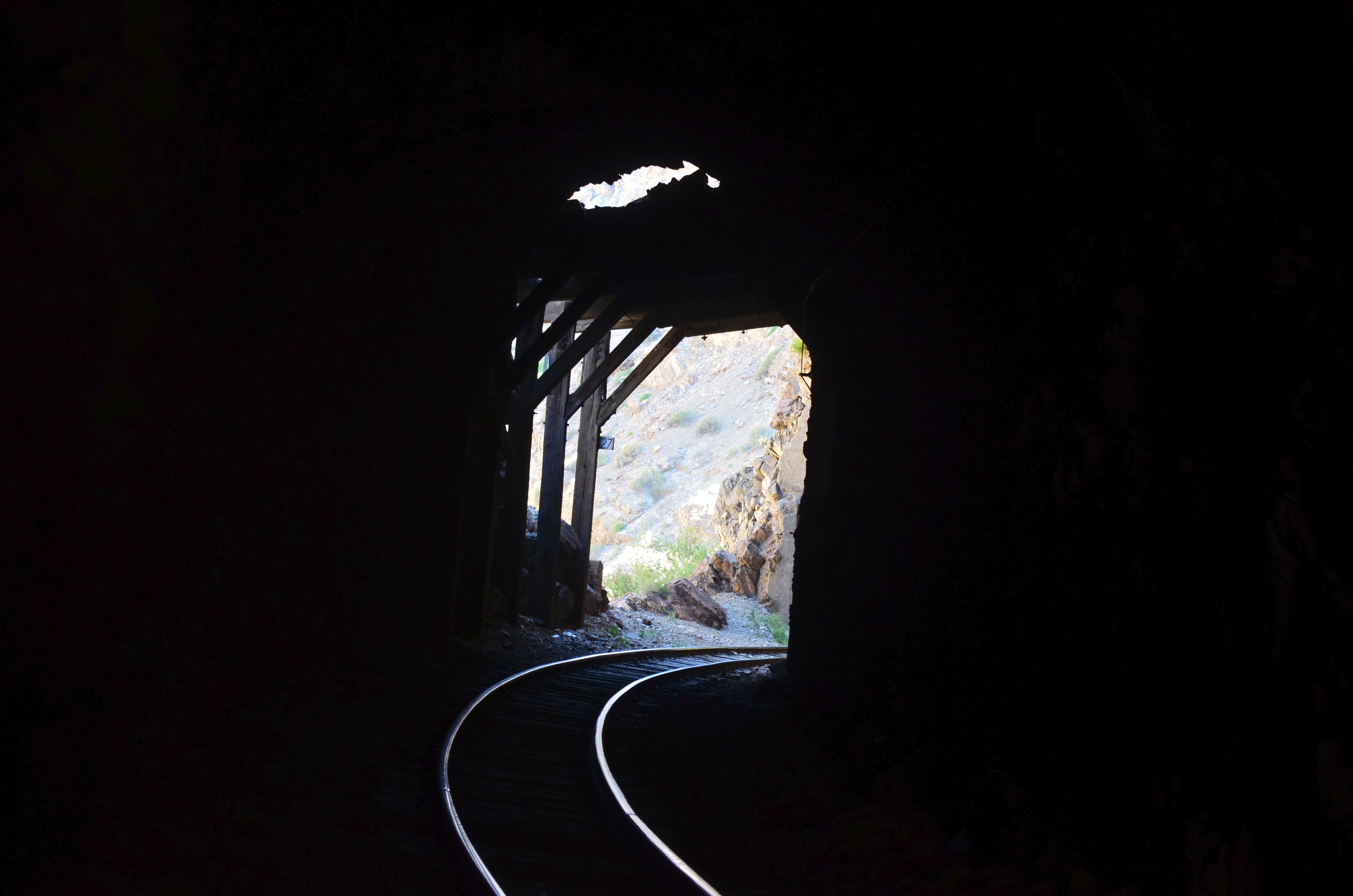 The train goes up one side of the canyon and into a tunnel. The tunnel opens into the middle of the gorge, the train crosses a short bridge, and goes into a tunnel on the other side. So far as I know, this bridge is actually safe, but it is also very scary. Sadly, I could not get much closer. At a lower water level I might have tried to hike below, but not this time. And this section of the railroad is still used by the nearby mine. I have no idea what the train schedule is and I don't want to get stuck in that tunnel when a train comes. Some of the abandoned tunnels had emergency alcoves for a person to duck into, but I would not bet my life on finding one.