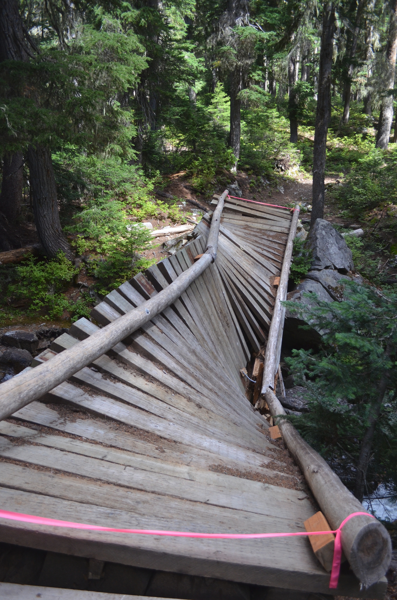 This bridge was located during hike on the Pacific Crest Trail, south of the North Cascades Highway. Being a popular trail there are footbridges across many of the larger creeks. This is especially useful during the spring snow melt. Sadly, this foot bridge came to an unfortunate end.