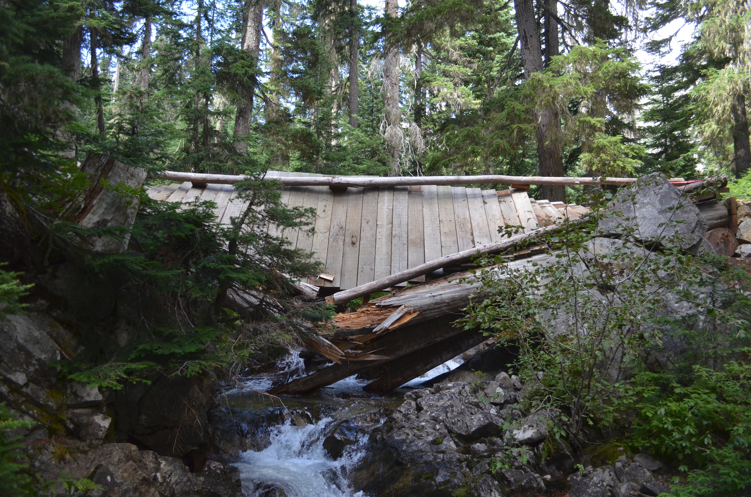 Author's Note: The forest service is required to construct and maintain numerous foot bridges in remote locations with a minimal budget. They do not have the resources to build and monitor bridges in the same way as the various departments of transportation do. Major contributing factors in this bridge failure are likely the remote location, limited materials for construction, and a lack of Forest Service resources.